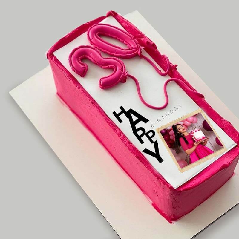 – قالب کیک مستطیل با روکش خمیر فوندانت است. روی کیک عدد سال تولد با حمیر فوندانت به شکل بادکنکی قرار می گیرد. متن Happy Birthday روی کیک چاپ می شود. اگر عکس آپلود کنید عکس دلخواه شما نیز مثل مدل سایت، روی کیک چاپ می شود. همچنین بدون عکس نیز می توانید سفارش دهید.